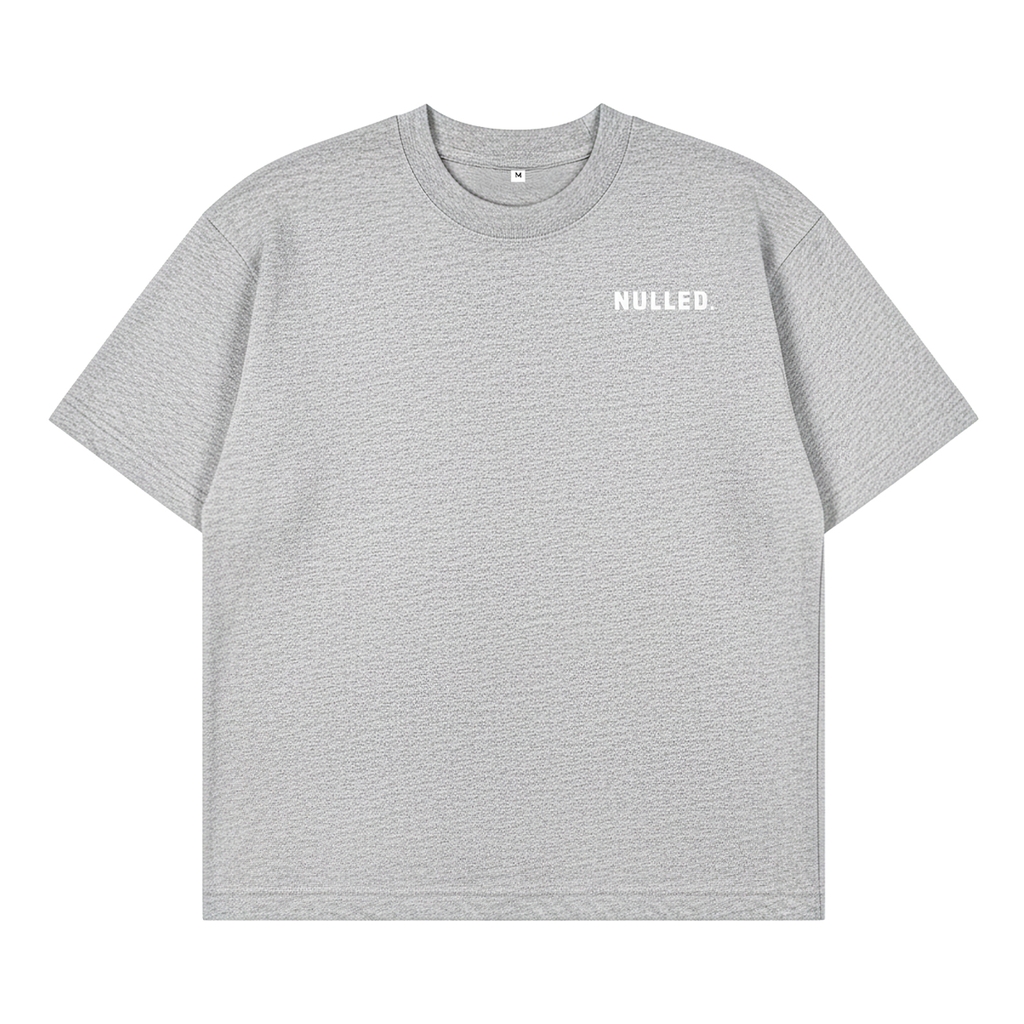 Sự kết hợp giữa nền xám trắng và chữ trắng tạo nên một tổng thể nhẹ nhàng nhưng vẫn đủ nhận diện, đúng tinh thần của áo thun boxy local brand NULLED.