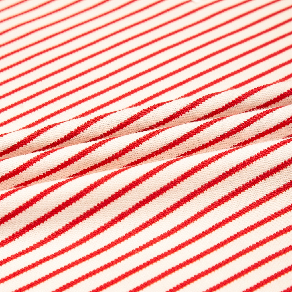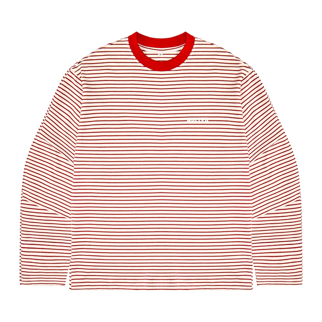 Áo thun boxy tay dài kẻ sọc được xây dựng trên phom boxy chuẩn streetwear, chiều dài vừa phải, form suông giúp tổng thể outfit trông gọn gàng và cá tính hơn. Họa tiết sọc ngang nhỏ đều màu đỏ trên nền kem tạo hiệu ứng thị giác cân đối, giúp chiếc áo nổi bật nhưng không hề rối mắt. Thiết kế đồng nhất cả mặt trước và mặt sau mang lại cảm giác chỉn chu, đúng tinh thần của một sản phẩm local brand chất lượng.