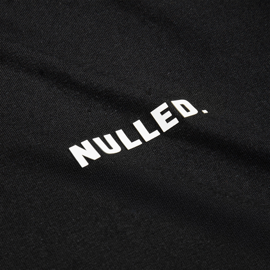 Logo NULLED màu trắng được in bằng kỹ thuật in cao ép nhiệt, tạo cảm giác nổi rõ trên nền áo đen: