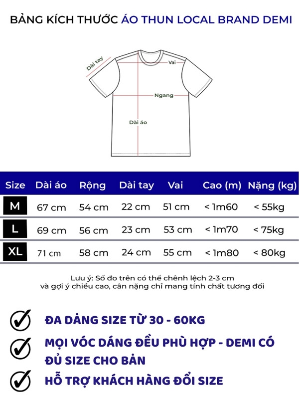 Kích cỡ ( size) áo thun local brand giá rẻ DEMI