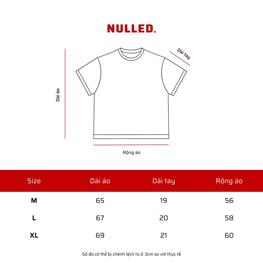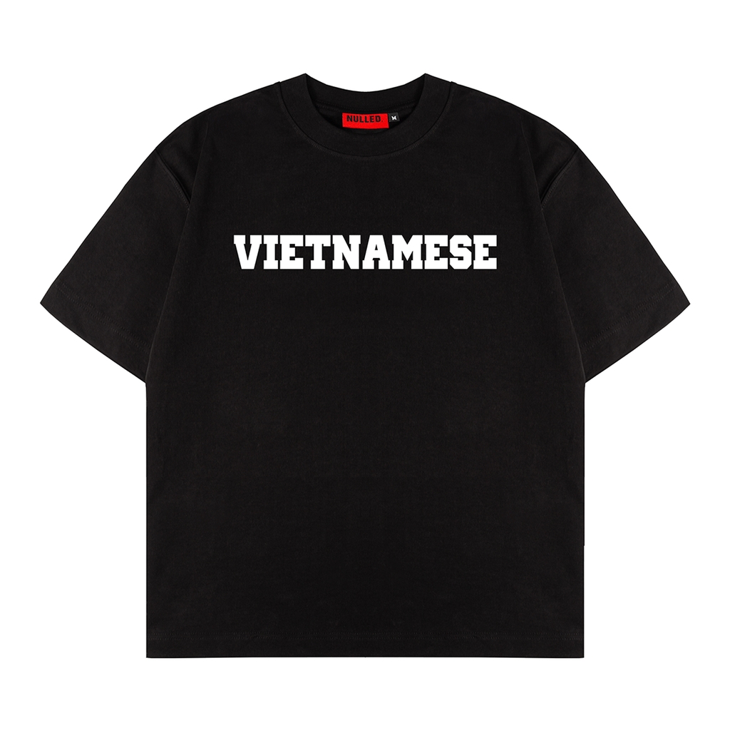 Điểm nhấn chính là hình in dòng chữ “Vietnamnese” sắc nét ở mặt trước – một cách thể hiện tinh thần yêu nước đầy hiện đại, mang hơi thở văn hóa Việt trong phong cách thời trang đương đại. Tag vải logo NULLED sau lưng tinh tế, giúp hoàn thiện tổng thể tối giản nhưng không hề mờ nhạt.
