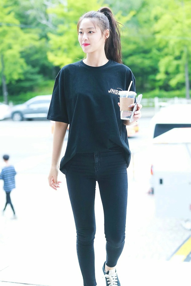 Áo thun được lòng nhiều sao nữ Hàn Quốc bởi tính ứng dụng cao, dễ tìm mua tại các shop thời trang và mặc đẹp quanh năm. Seulgi (Red Velvet) diện áo thun màu đen tôn làn da trắng mịn của cô. Mẫu áo thun của nữ ca sĩ có dáng lửng, khi phối cùng quần skinny jeans và thực hiện kỹ thuật chiết eo cao sẽ làm cơ thể nhìn cao ráo, cân đối.