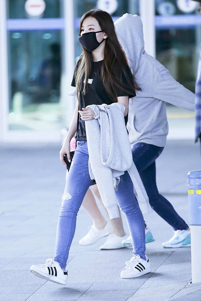 Seulgi ưu ái phong cách tối giản cho trang phục sân bay nhằm mang lại sự thoải mái tối đa khi di chuyển trong thời gian dài. Thành viên Red Velvet chọn 2 set đồ khác nhau gồm áo thun tay ngắn, quần jeans màu trơn với cùng đôi giày adidas Superstar kinh điển.