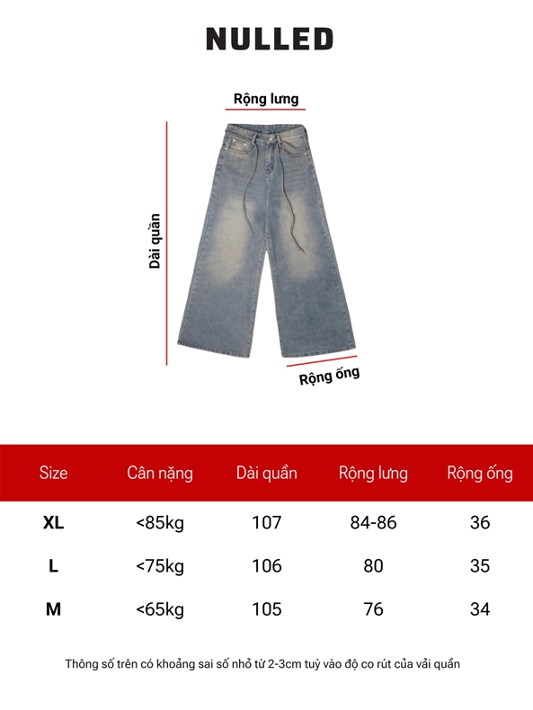 Thông tin kích thước quần jean wash màu ống rộng local brand NULLED
